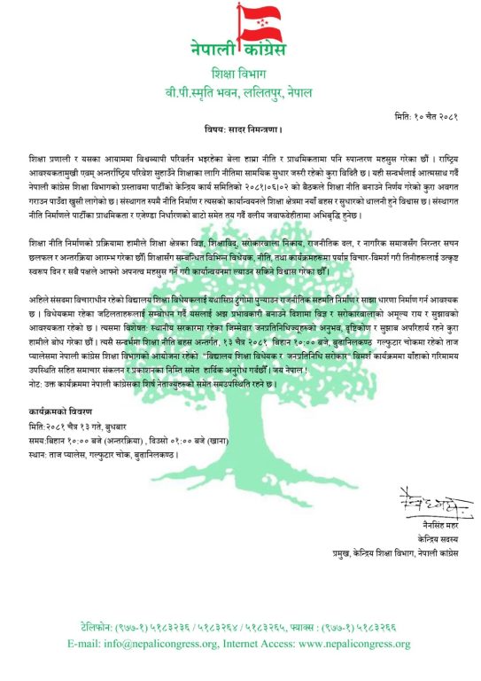 शिक्षासँग सम्बन्धित विभिन्न विधेयक, नीति तथा कार्यक्रमहरूमा पर्याप्त विचार-विमर्श गरी तिनीहरूलाई उत्कृष्ट स्वरूप दिन नेपाली कांग्रेसको विमर्श कार्यक्रम चैत्र १३ गते वुधवार २०८१ बिहान १०:०० बजे, बुढानिलकण्ठ गल्फुटार चोकमा रहेको ताज प्यालेसमा संम्पन्न हुने आयोजकले जानकारी गराएको छ।