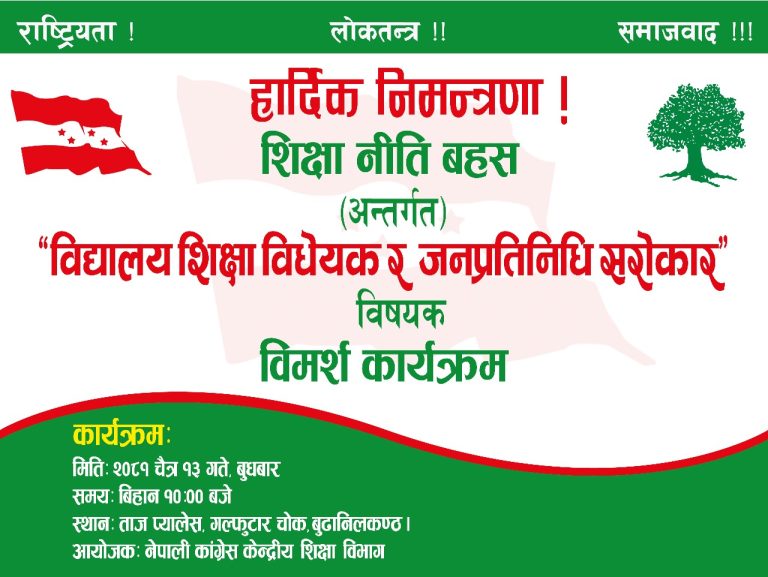 संसदमा विचाराधीन रहेको “विद्यालय शिक्षा विधेयक” लाई टुंगोमा पुऱ्याउन नेपाली कांग्रेस शिक्षा विभागले शिक्षा नीति बहस कार्यक्रम अन्तर्गत “विद्यालय शिक्षा विधेयक र जनप्रतिनिधि सरोकार” विषयक विमर्श कार्यक्रमको आयोजना गर्ने भएको छ।