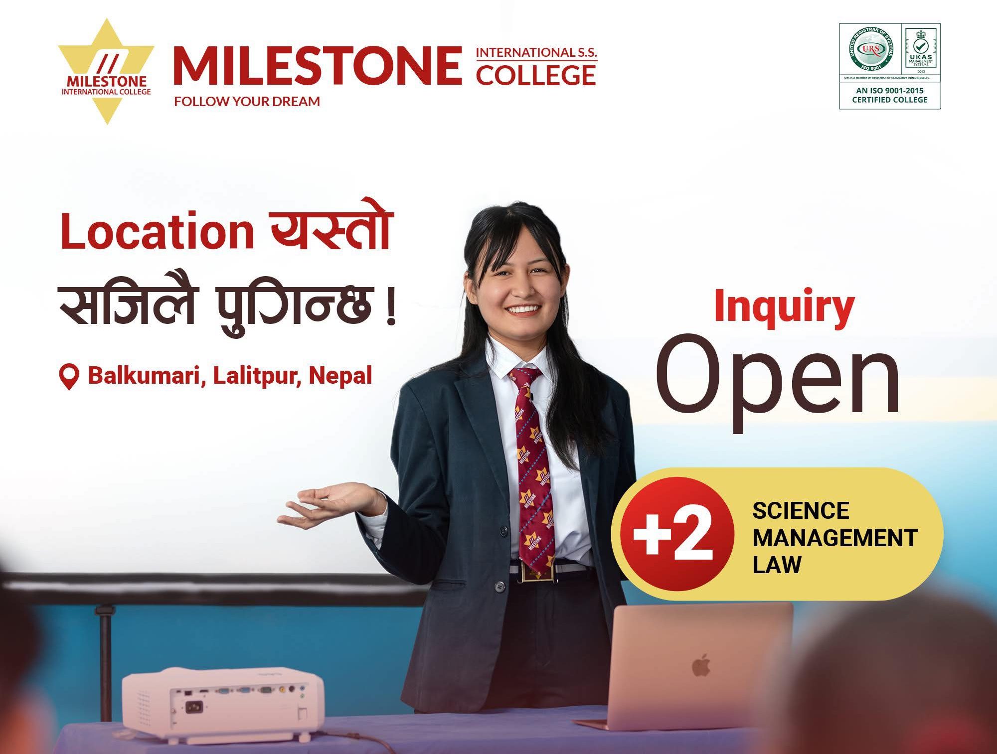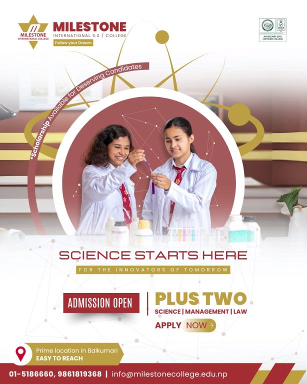 ललितपुर, बालकुमारीमा आफ्नै सुविधा सम्पन्न भवनमा अवस्थित माईलस्टोन कलेजमा कक्षा ११ मा विज्ञान ,व्यवस्थापन तथा कानुन संकायमा भर्ना प्रकिया सुरु भएको छ।सुविधा सम्पन्न ल्याव ,प्ले ग्राउण्ड देखि विद्यार्थीका लागि चाहिने अतिरिक्त क्रियाकलापहरुमा ध्यान पुर्याउदै आईरहेको यस कलेजको भर्ना प्रकिया बारे थप बुझ्नको लागि देहायको ठेगानामा सम्पर्क गर्न सक्नु हुनेछ।