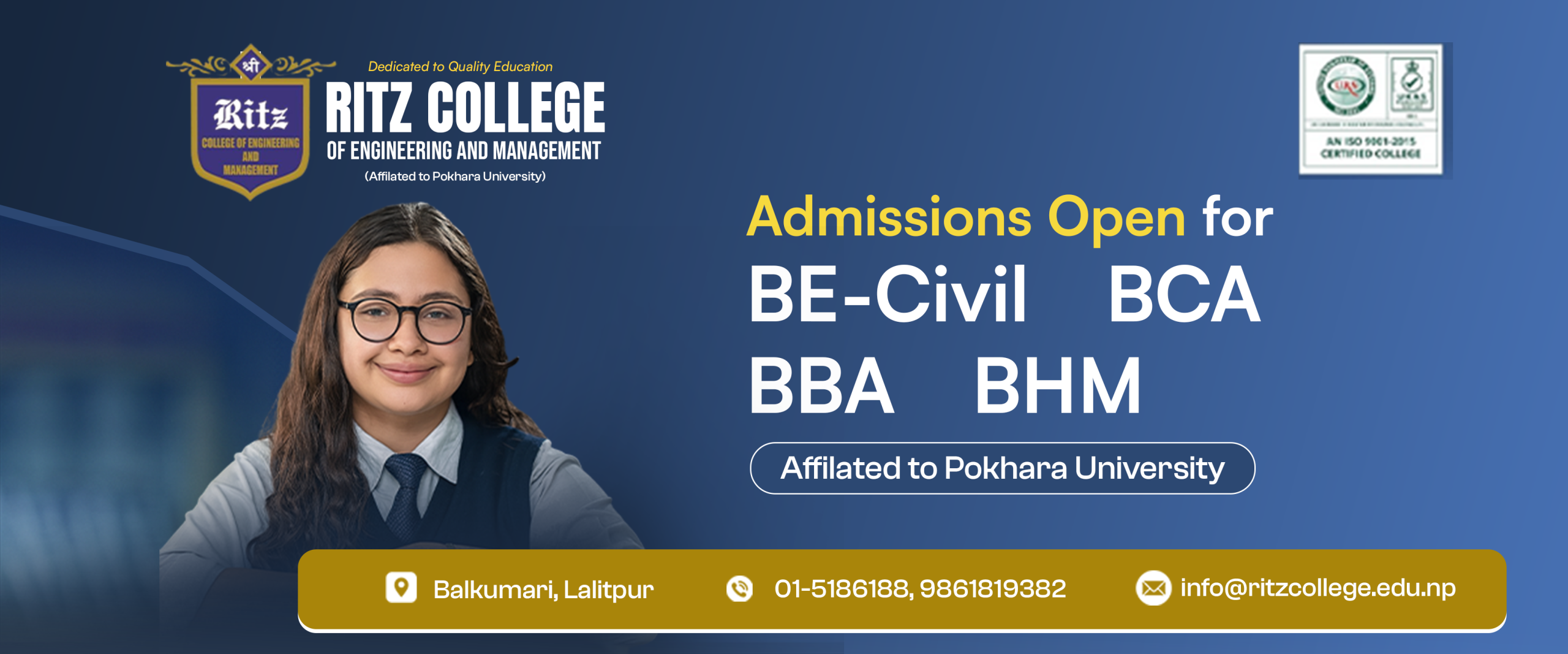 पोखरा विश्वविधालयको सम्वन्धन प्राप्त Ritz College of Engineering and Management मा शैक्षिक सत्र २०८२को लागि स्नातक तहका BHM,BCA, BE Civil र BBA कार्यक्रमहरुमा भर्ना प्रक्रिया सुरु भएको छ।