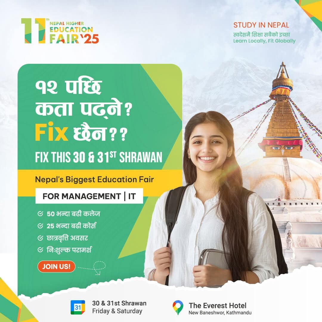 नेपाली विद्यार्थीहरुलाई नेपालमा रहेका प्रतिष्ठित विश्वविधालयहरु, विद्यार्थीका चासोका विषयहरु, र ति विषय पढाई हुने कलेजहरु आदिको बारेमा प्रत्यक्ष रुपमा जानकार गराउने उदेश्यका साथ कक्षा १२ उत्रिर्ण विद्यार्थीहरु लक्षित “नेपाल हाईअर एजुकेसन फेयर” आगामी श्रावण ३० र ३१ गते काठमान्डौको बानेश्वरमा अवस्थित एभेरेष्ट होटलमा संचालन हुने भएको हो।