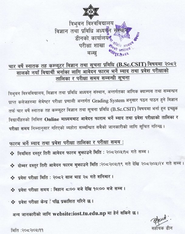 त्रिभुवन विश्वविद्यालय विज्ञान तथा प्रविधि अध्ययन संस्थान, डीनको कार्यालय, परीक्षा शाखा बल्खुले चार वर्षे स्नातक तहको कम्प्युटर विज्ञान तथा सूचना प्रविधि (B.Sc.CSIT) विषयमा २०८२ सालका लागि नयाँ विद्यार्थी भर्ना सम्बन्धी आवेदन फारम भर्ने, स्थान तथा प्रवेश परीक्षा तालिका र परीक्षा समय सम्बन्धी महत्वपूर्ण सूचना प्रकाशित गरेको छ।