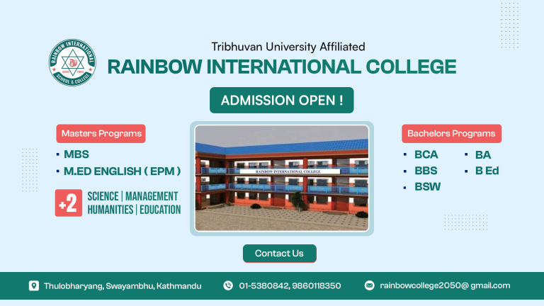 भर्ना सम्बन्धि थप जानकारीको लागि काठमाडौँको स्वयम्भु ,ठुलो भर्याङ्गमा रहेको रेन्बो इन्टर्नेशनल कलेजमा सम्पर्क गर्न सक्नु हुनेछ।