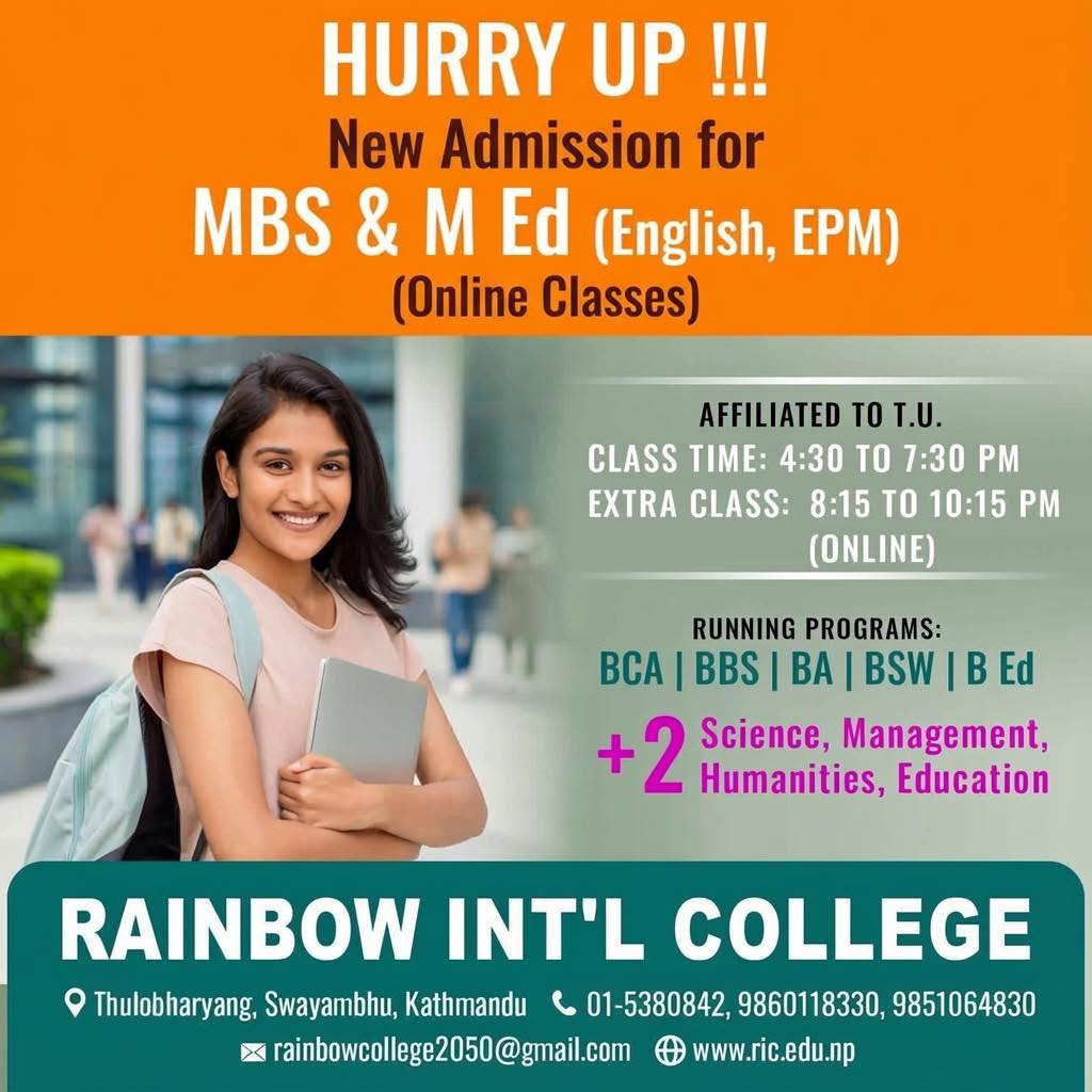 त्रि. वि को सम्वन्धनमा संचालित रेन्बो इन्टर्नेशनल कलेजमा अनलाईन कक्षाको सुविधा सहित MBS & M.Ed (EPM) कार्यक्रमहरुमा भर्ना प्रक्रिया सुरु भएको छ।
