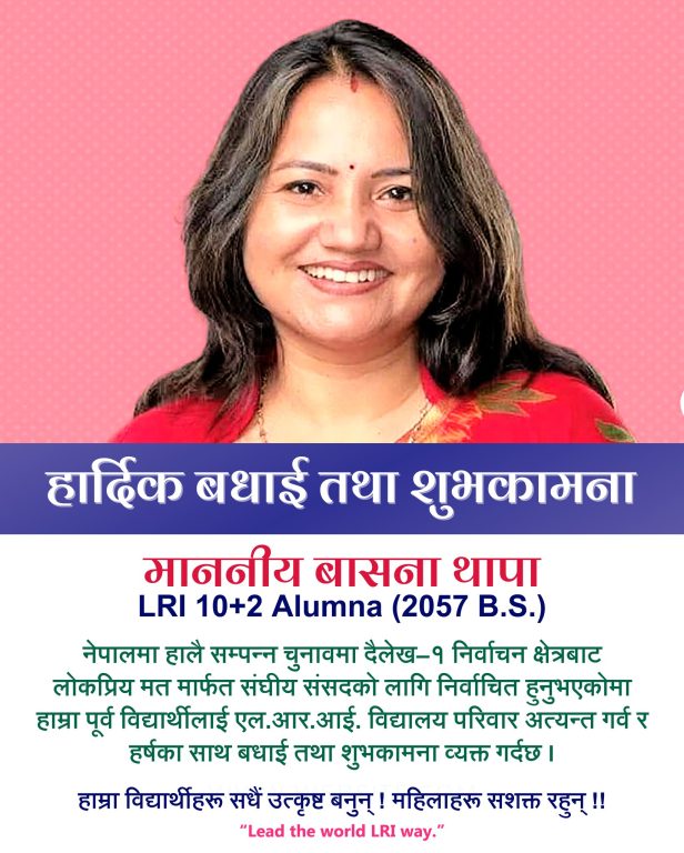 पूर्व विद्यार्थीको यो सफलतामा एल. आर. आई ले गर्व महशुस गर्दै खुशी ब्यक्त गरेको छ।