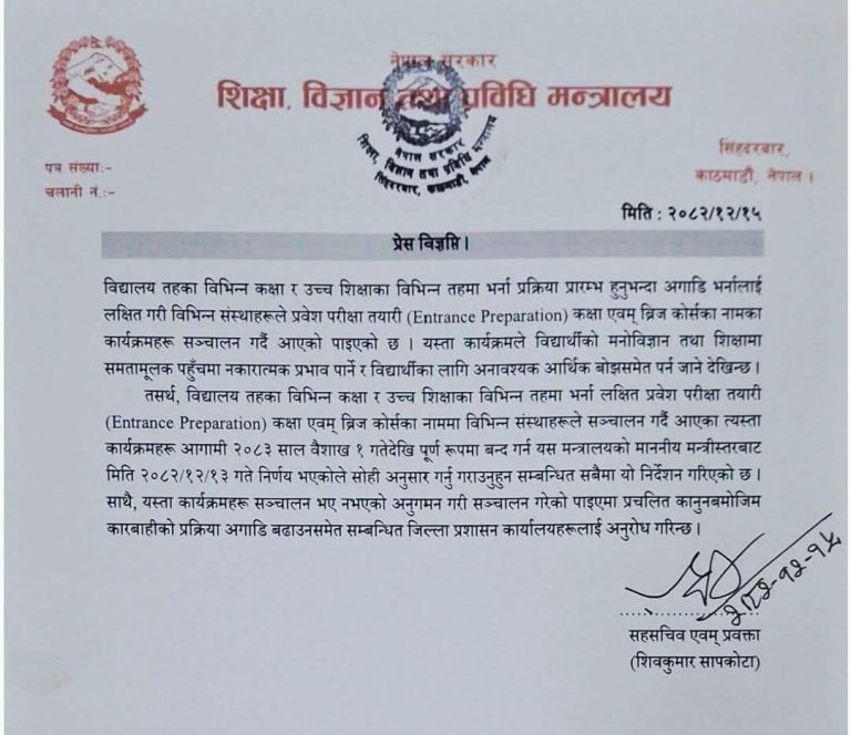शिक्षा, विज्ञान तथा प्रविधि मन्त्रालय ले ‘प्रवेश परीक्षा तयारी’ कक्षा तथा ब्रिज कोर्सहरू बन्द गर्ने निर्णय गरेको छ।
